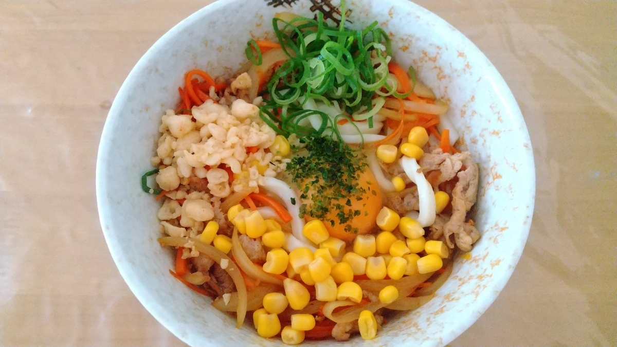 うどんを入れ、その上に真ん中が空くように豚肉や人参、玉ねぎを盛り付ける。空いた真ん中に卵を入れる。お好みで天かすやコーン、ネギ等をトッピングする。