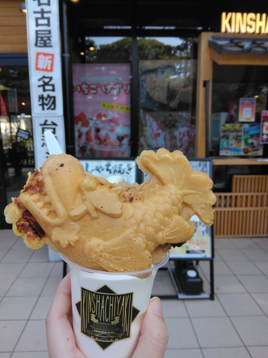 名古屋城の近くの金シャチ横丁で売っていた金シャチ焼きソフトです。